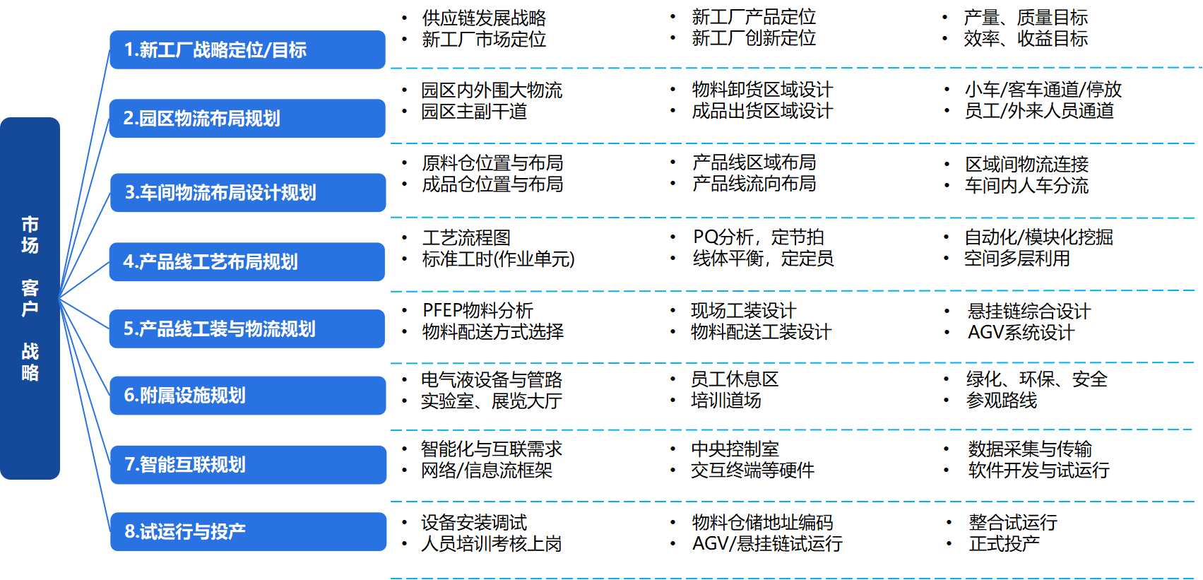 工廠物流布局是指基于精益思想和方法,為增加設(shè)備、設(shè)施、資材、人力資源和能源使用率,提升空間利用率,降低成本,提高生產(chǎn)效率和生產(chǎn)安全性,對公司或工廠內(nèi)所有設(shè)施、物流路線重新布置的一系列的系統(tǒng)性的活動。主要包括工廠大物流和樓棟、車間、倉庫的物流布局。