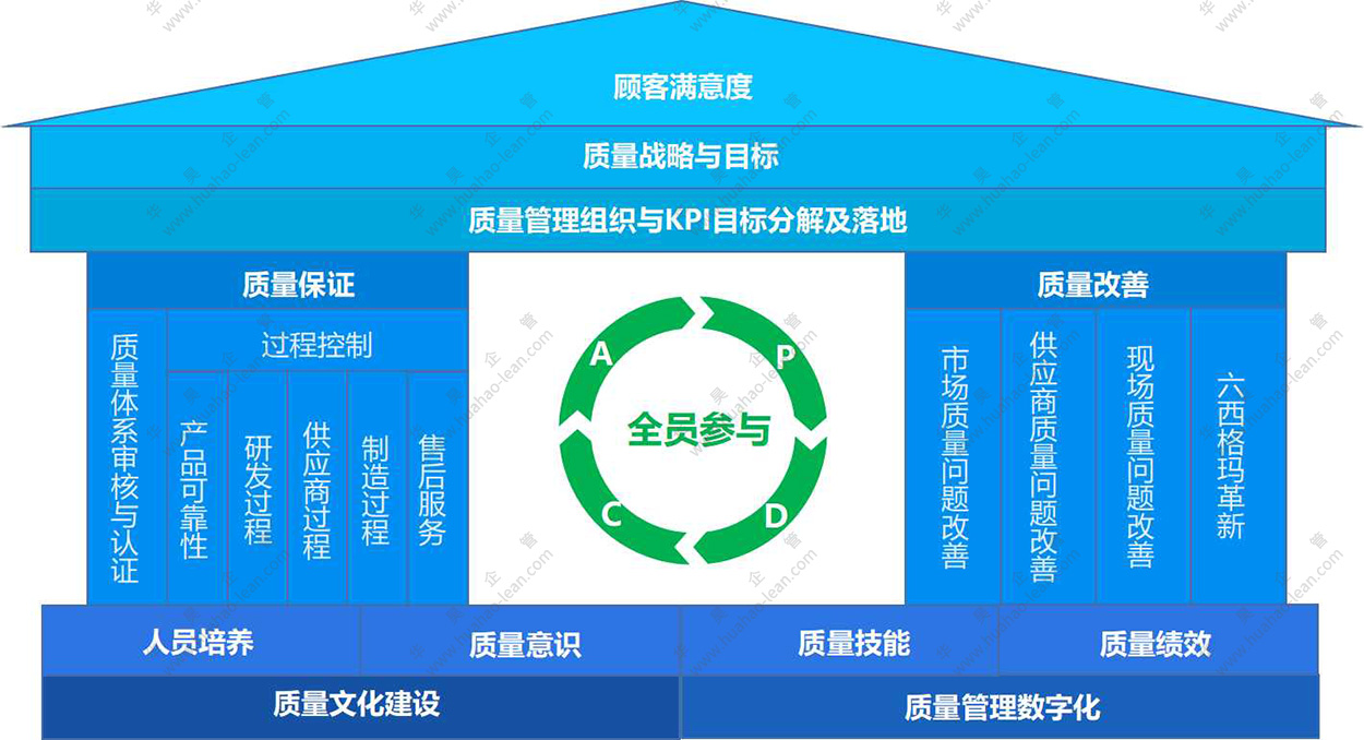 全員品質(zhì)管理,即TQM(Total Quality Management),又稱全面質(zhì)量管理,是指一個組織以質(zhì)量為中心,以全員參與為基礎,目的在于通過顧客滿意和本組織所有成員及社會收益而達到長期成功的管理途徑。全面質(zhì)量管理的基本方法可以概況為四句話十八字,即“一個過程,四個階段,八個步驟,數(shù)理統(tǒng)計方法”。華昊企管全員品質(zhì)管理方法體系,則是在傳統(tǒng)TQM的基礎上,更加強調(diào)SQM(標準品質(zhì)管理 Standard Quality Management)與QCC(品管圈 Quality Control Circles)、六西格瑪?shù)纳罨菩信c創(chuàng)新延展,并與信息化的深度融合及應用。